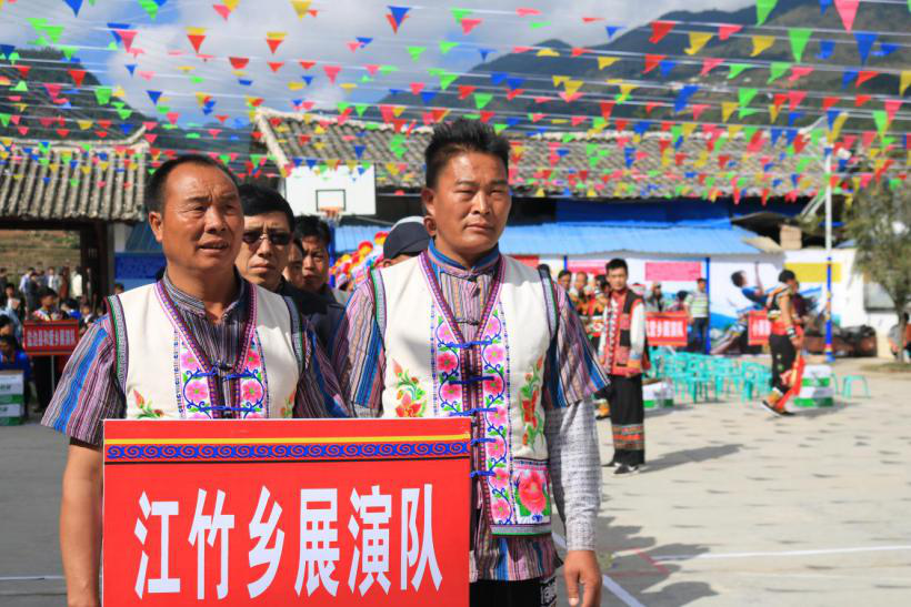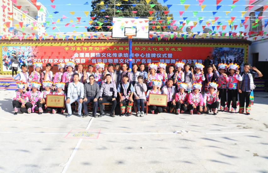 随着脱贫攻坚工作持续深入推进落地,地处金沙江干热河谷腹地的江竹乡各族群众生产生活条件得到了巨大改变,物质基础进一步夯实,产业结构得到调整,人民生活水平得到大幅度的提升和改善。在物质条件改善的同时,乡党委政府也将精神文明建设提上了新的高度加以重视,在全乡组建少数民族蹢脚舞队,载歌载舞庆祝美好生活的同时,通过丰富精神文化生活不断凝聚民心,促进民族团结进步。 2017年11月10日,江竹乡蹢脚舞蹈队应邀赴小黑箐乡白沙村参加“省级非物质文化遗产——蹢脚舞”展演,江竹乡精心编导4个节目参赛,通过与其他6支队伍共19个节目的紧张的角逐,江竹乡舞蹈队最终有两个节目分获二、三等奖的好成绩。 此次比赛是江竹乡设立35年来第一次参加全县性的文化交流活动,通过交流,大大开阔了江竹乡少数民族群众的眼界,同时也充分向全县人民展现了江竹少数民俗风貌,为丰富和完善会理民俗风情作出了积极贡献。  江竹乡参加蹢脚舞比赛展演队  表演队队员合影 |