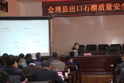为培植我县现代农业发展,着力打造特色农产品区域品牌,提升我县食品农产品整体质量安全水平,拓展国际市场,促进我县外贸发展,进一步实现助农增收,农业增效,全面深入贯彻党的“十九大”精神,按照“政府主导,部门联动,龙头带动,全民行动”的工作机制,会理县于11月17日,成功召开了“出口石榴质量安全示范区创建工作动员暨实务培训会”。会议由会理县人民政府副县长沙正才主持,四川检验检疫局动植物检疫处副处长王勇涛、县委副书记阿呷说哈、攀枝花检验检疫局副局长叶丘陵出席会议并讲话,凉山州商务投促局副局长肖友呷、外经贸科科长、凉山州农牧局植物检疫站站长、攀枝花检验检疫局一行工作人员列席会议。11个县级相关部门、14个相关乡镇(街道办事处)、76个创建重点村、12家石榴专业合作社、10家农资经销商、5家龙头企业、5家石榴营销电商、县农牧局相关业务站、片区农牧站、乡镇农牧站等负责人以及石榴技术员共180余人参加了此次培训会。