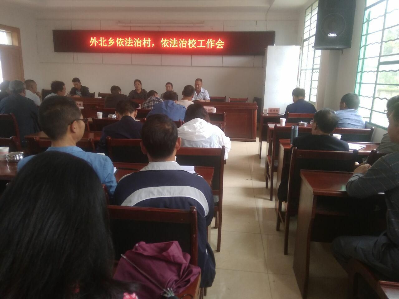 2018年7月12日,外北乡召开“依法治校”工作会,会议由乡村干部及各小学负责人参加。乡党委书记彭良及乡中心小学校长张国荣参加会议并讲话,指出“依法治校”是现代学校制度建设的灵魂,总结通报了全乡依法治教(校)工作情况,对下一步的工作提出了要求:一是学好法,加强学习培训,完善规章制度,推进现代学校制度建设;二是用好法,强化法律意识,做到有法可依、执法必严、办事依法、解决问题靠法;三是加强创新,结合教育规律和特点,寓教于乐,增强师生法治意识;四是抓好落实,确保依法治教工作取得新成效。